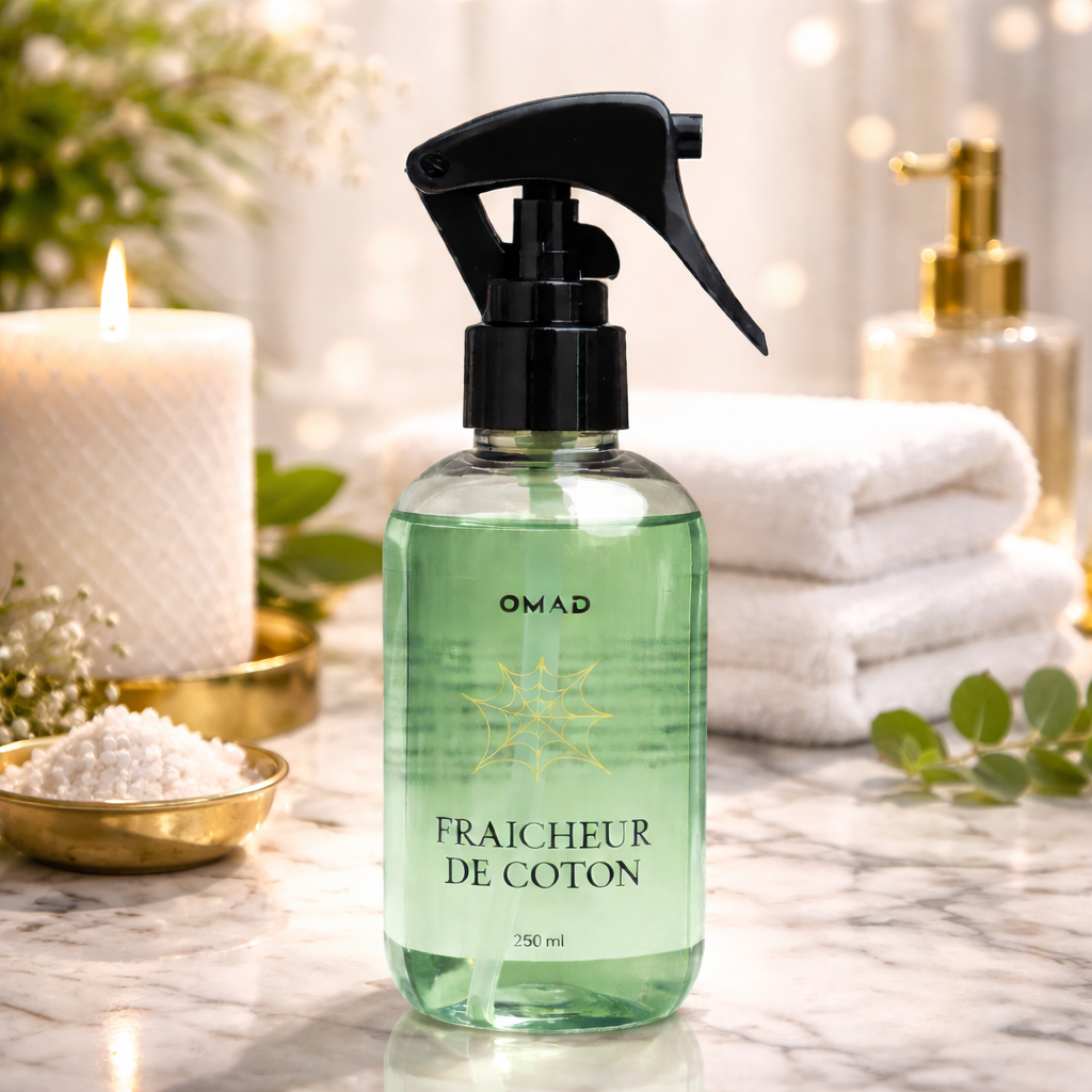 Tauchen Sie ein in das Gefühl frisch gewaschener Wäsche mit OMAD Coton Frais , einem Stoffspray mit sauberen, weichen und beruhigenden Noten.